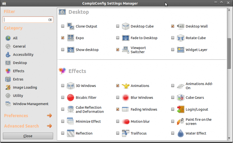 Here comes the eye candy user experience. Compiz program can give you almost 30-40 configuration items to be done to the Desktops. 10 out 10 to user experience. Wobbly windows, 3D Windows and Rotate Desktop are tempting.