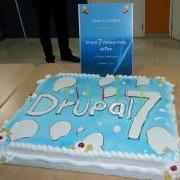 DRUPAL CAKE: Everyone then went to Cafeteria @ CIGNEX for Drupal Cake Cutting. Everyone shouted 4 .... 5 ..... 6 ...... 7 ....... and the 7 cake candles were blown off by Preeti. Cake was cut by Hardik, Preeti (who won most of the gifts in Drupal Quiz), and Mrudang Mehta, Special Guest for the evening and Professor at DDIT, Nadiad. And then everyone got into discussion with each other over Tea/Coffee and Snacks.