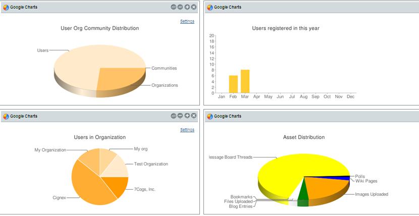 This portlet demonstrates how to use Google charts to generate reports in Liferay.