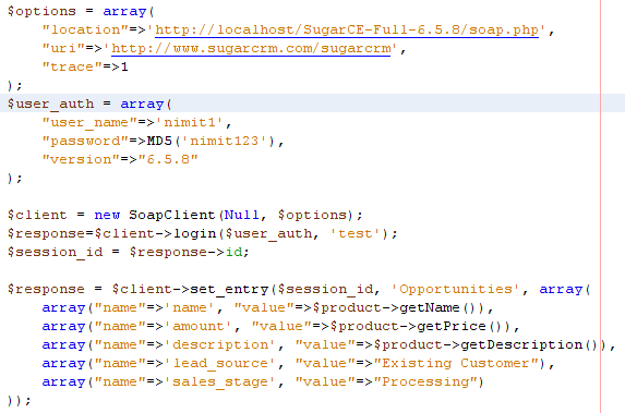 In the above code, the “$options” array contains information related to soap file location and uri. Further, the “$user_auth” array contains user authentication details such username, password and SugarCRM version. Next, one needs “session_id” for accessing 3rd party applications by using SOAP protocol. Lastly, the “$response” array for setting an entry under Opportunity module in SugarCRM containing “name” and “value” pair. “Name” contains field name of table and “value” contains the product related information to be added to table.